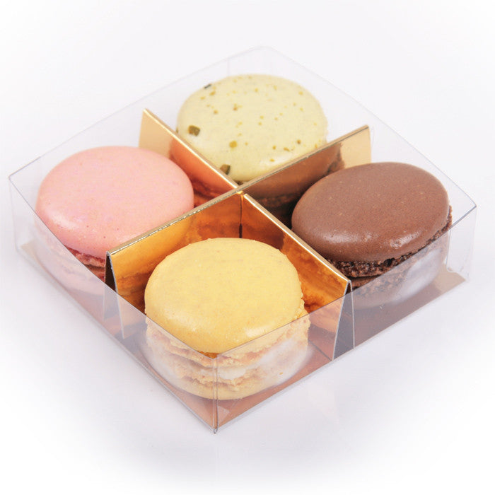 4 macarons in transparent box