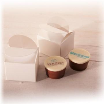 1 ambachtelijke bonbon met logo in verpakking (minimaal 100 stuks)