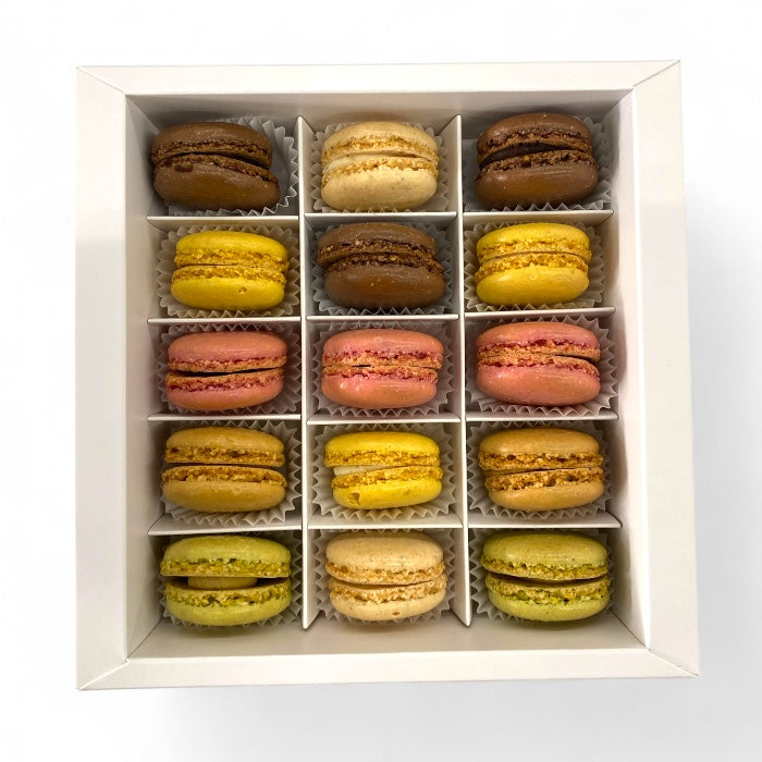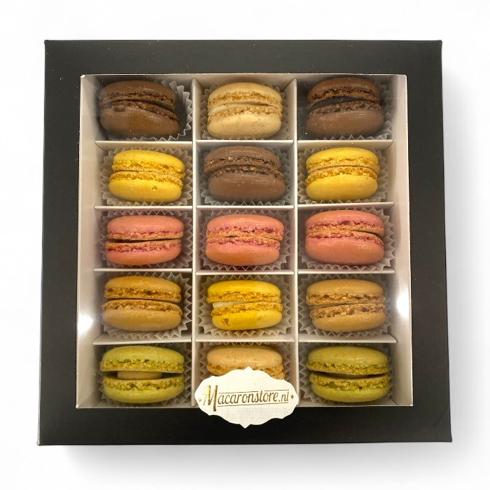 Macarons de Paris in 6 heerlijke smaken: Vanille, Koffie, Chocolat, Framboos, Citroen en Pistache.  Een mooie mix van de smaken. 15 stuks in het totaal verpakt in een luxe doosje. Voor bedrijven kunnen wij ook een logo aanbrengen op het doosje.