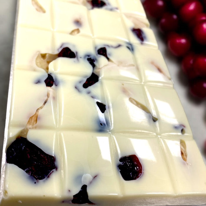De lekkerste Belgische witte (eerlijke) chocolade rijkelijk gevuld met cranberries en vers geroosterde amandelen. Ze laten zich prachtig zien aan de bovenkant van de reep. Volledig met de hand gemaakt in ons atelier in Reeuwijk.