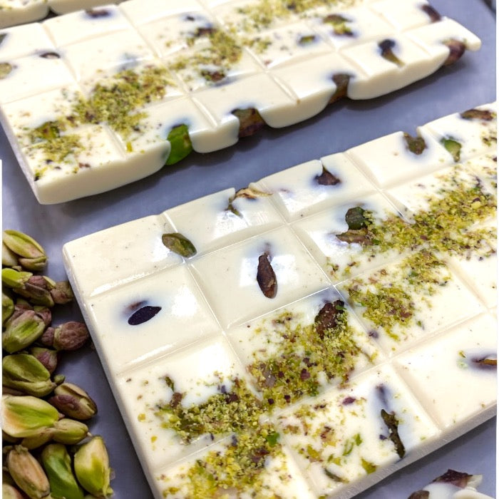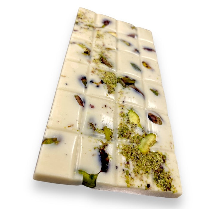 De lekkerste Belgische witte (eerlijke) chocolade rijkelijk gevuld met vers geroosterde pistachenoten. Ze laten zich prachtig zien aan de bovenkant van de reep en mooi gedecoreerd met gemalen pistachenoten. Volledig met de hand gemaakt in ons atelier in Reeuwijk.